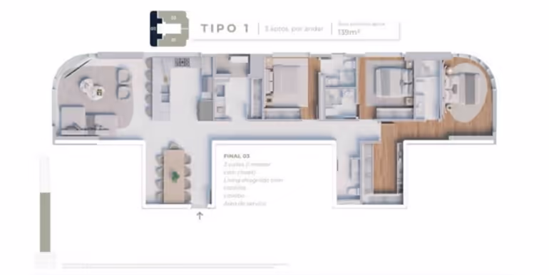 - Setor 01 – Tipo 03: 3 Suítes / 139 m²