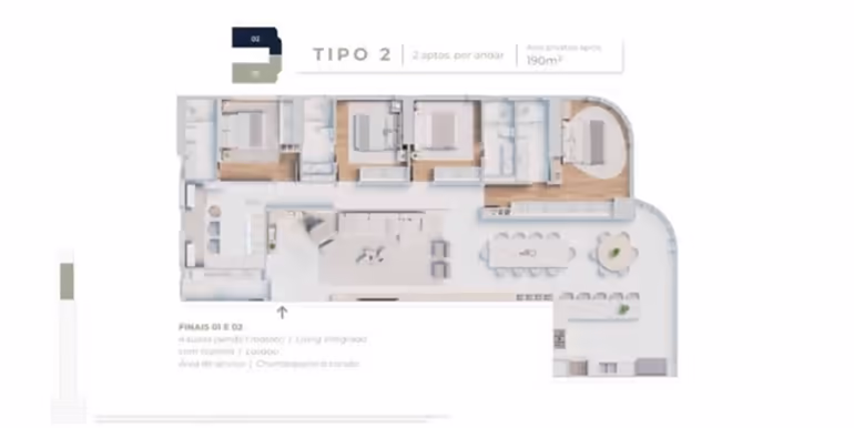 - Setor 02 – Tipos 01 e 02: 4 Suítes / 190 m²