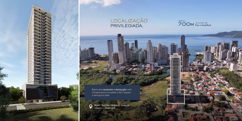 Apartamentos no Edifício 14 Bis Home Club em Porto Belo. Imóvel na planta, com 1 a 2 suítes, churrasqueira a carvão, lazer home club com mais de 1.400 m² e localizado a apenas 700 metros do Molhe, do Píer e do Hard Rock.