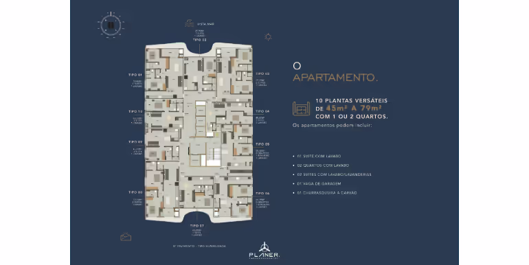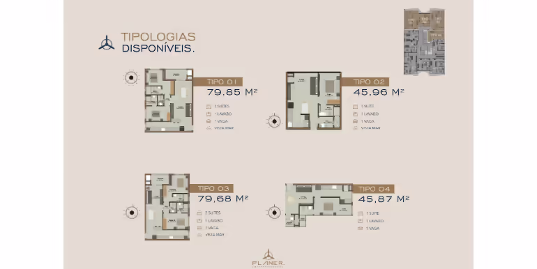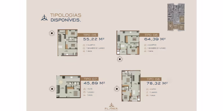 - Tipos 01, 03 e 08: 2 Suítes / 78 a 79 m²