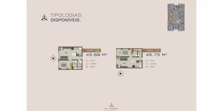 - Tipos 02, 04, 07, 09 e 10: 1 Suíte / 45 m²