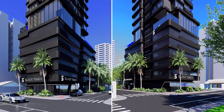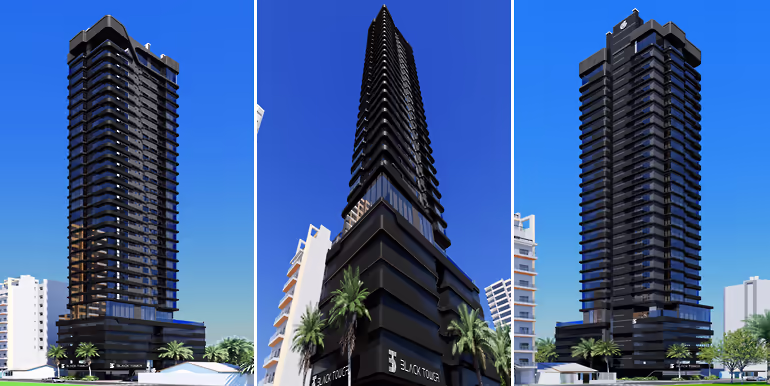 Apartamentos no Edifício Black Tower em Porto Belo. Imóvel na planta, com 1 dormitório ou 2 suítes, living integrado com churrasqueira a carvão, 1 vaga de garagem, área de lazer em 2 pavimentos, incluindo no rooftop e localizado a 800 metros da praia.