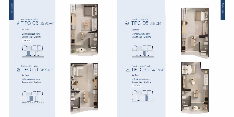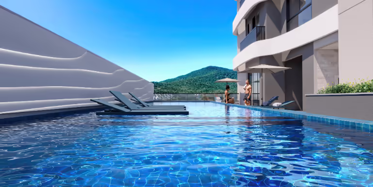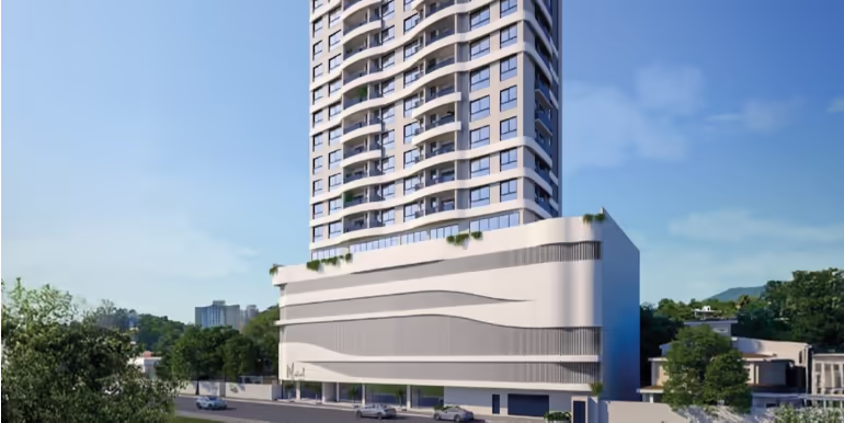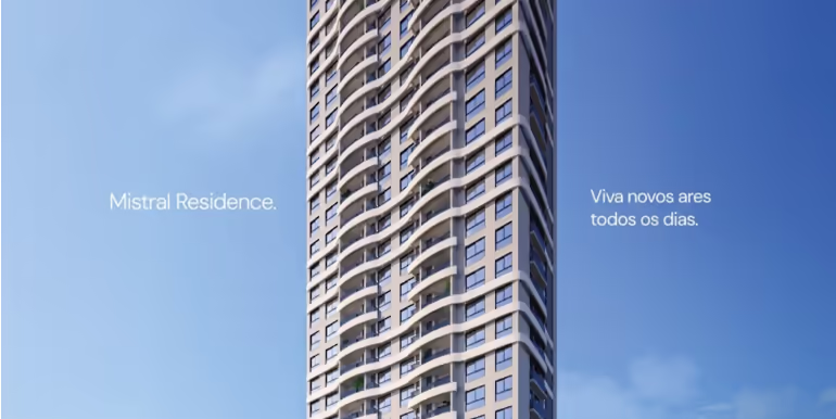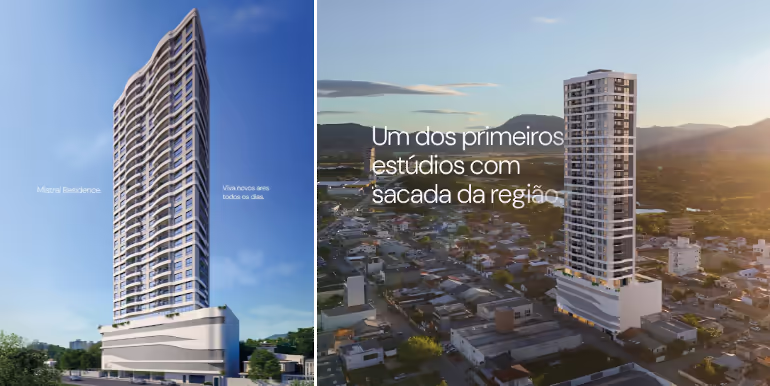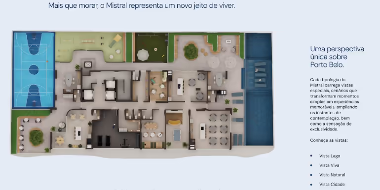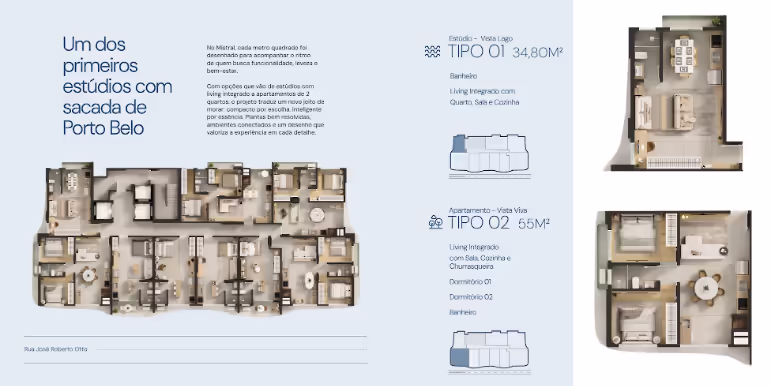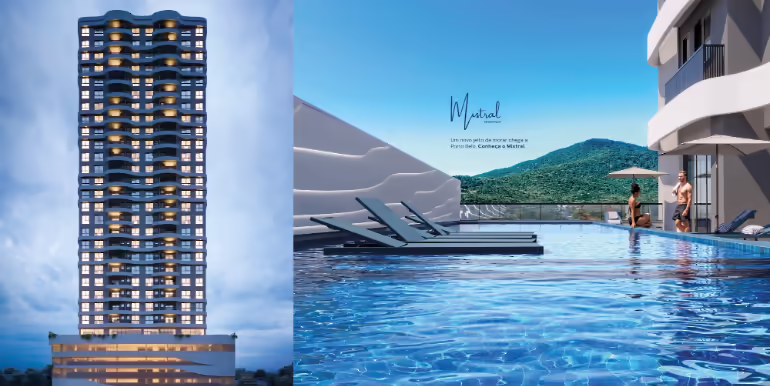 Apartamentos no Edifício Mistral em Porto Belo. Imóvel na planta, com opções studio ou de 2 dormitórios, living integrado e área de lazer com mais de 15 ambientes, num terreno de 1.200 m².