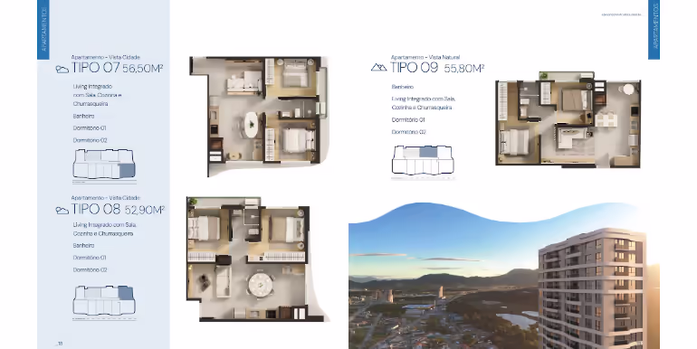 - Tipo 2 Dormitórios com Churrasqueira a Carvão / 52 a 57 m²