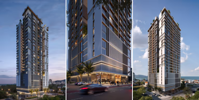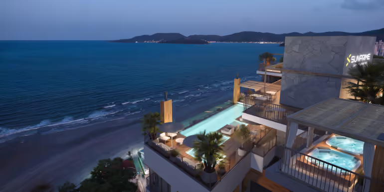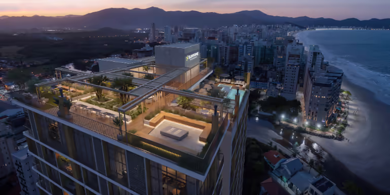 Apartamentos no Edifício Sunhaus Tower em Balneário Perequê, Porto Belo. Imóvel com 2 ou 3 suítes, lavabo, sacada com churrasqueira a carvão, 2 vagas de garagem e ampla área de lazer no rooftop, localizado a menos de 200 metros da praia e próximo da Marina Pública e do Hard Rock Cafe.