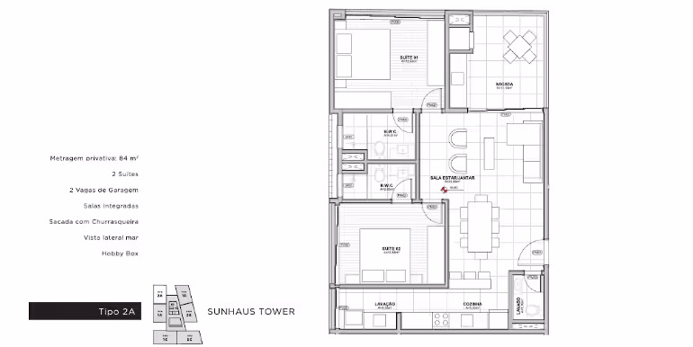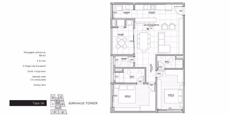 - Tipo A: 2 Suítes / 84 m²