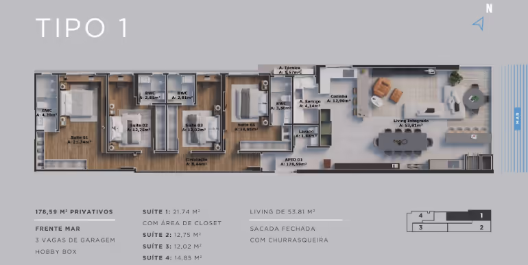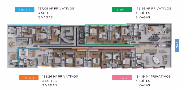 - Tipo 01: Frente Mar / 4 Suítes / 3 Vagas / 178 m²