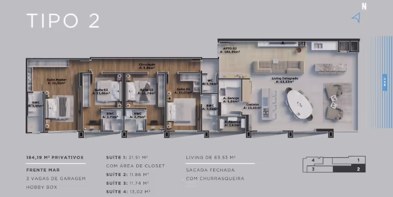 - Tipo 02: Frente Mar / 4 Suítes / 3 Vagas / 184 m²