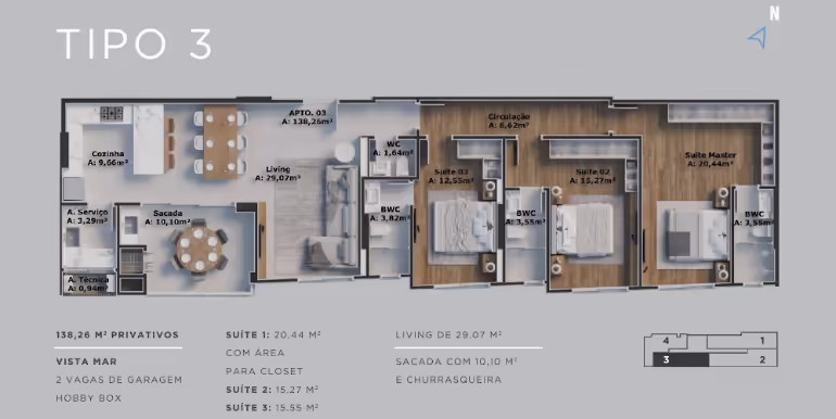 - Tipo 04: Lateral-Fundos / 3 Suítes / 2 Vagas / 138 m²