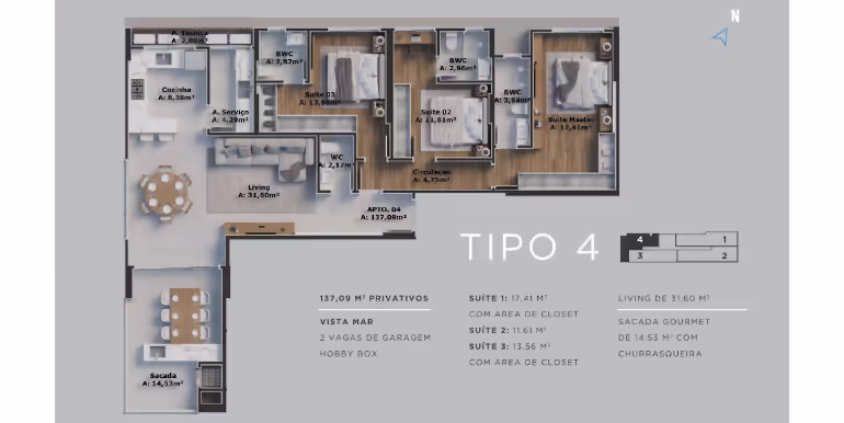 - Tipo 03: Lateral-Fundos / 3 Suítes / 2 Vagas / 137 m²