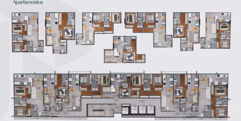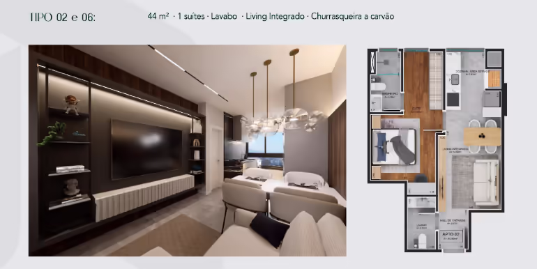 - Tipos 02 e 06: 1 Suíte / 44 m²