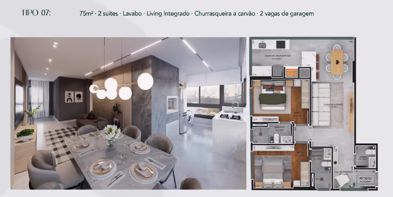- Tipos 03 e 05: 2 Demi-Suítes / 64 m²