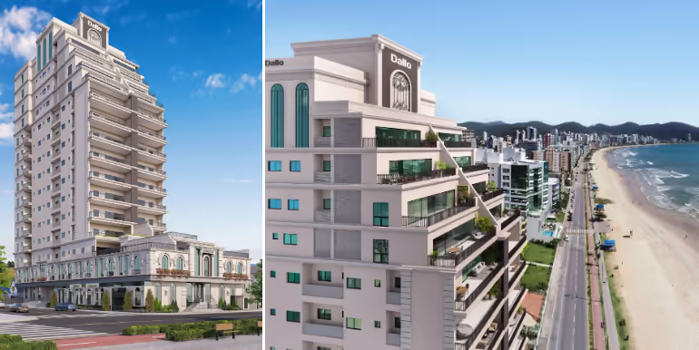 Apartamentos à venda no Edifício La Dolce Vita no Centro – Itapema. Imóvel frente mar, estilo Neoclássico, padrão Dallo, espaçoso, com 4 suítes, 3 vagas de garagem e ótima área de lazer, localizado na Av. Beira Mar.