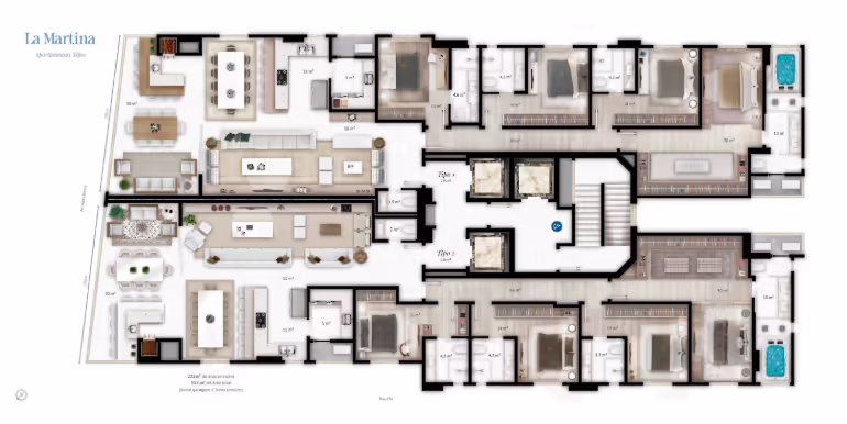Apartamentos à venda no Edifício La Martina em Meia Praia – Itapema. Imóvel estilo Neoclássico, padrão Dallo, espaçoso, com 4 suítes, sacada enorme com churrasqueira a carvão, 3 ou 4 vagas de garagem e área de lazer com mais de 900 m², localizado na Av. Nereu Ramos.