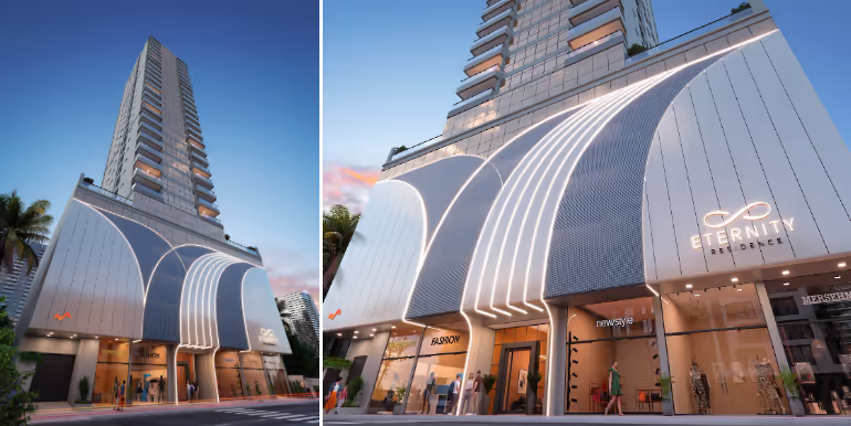 Apartamentos à venda no Edifício Eternity em Meia Praia, Itapema. Imóvel na planta, espaçoso, com 3 suítes, sacada com churrasqueira a carvão, 3 vagas de garagem e 2 pavimentos de área de lazer, incluindo no rooftop, localizado na 284, a menos de 600 metros da praia.