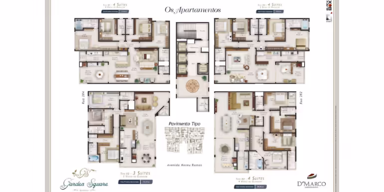 - Tipo 04: 4 Suítes / 179 m² / 3 Vagas / Frente Rua 202