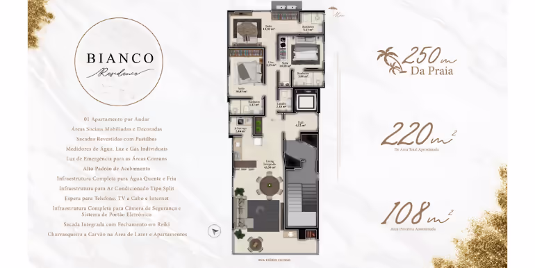 Apartamentos à venda no Edifício Bianco em Balneário Perequê, Porto Belo. Imóvel com a exclusividade de 1 apartamento por andar, 3 suítes, lavabo, espaço gourmet com churrasqueira a carvão, 2 vagas de garagem, boa área de lazer e localizado a apenas 250 metros da praia.