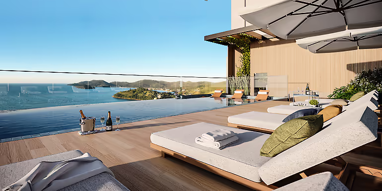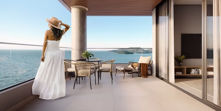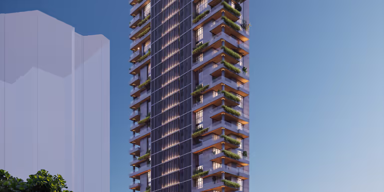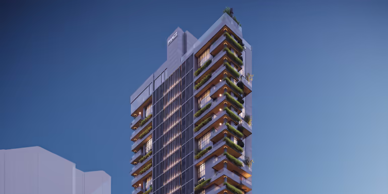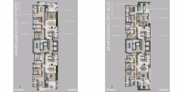 Apartamentos à venda no Edifício Blue Forest em Balneário Perequê, Porto Belo. Imóvel espaçoso, com 3 suítes ou 2 suítes + 2 demi-suítes, lavabo, sacada com churrasqueira a carvão, 2 ou 3 vagas de garagem e área de lazer home club com aproximadamente 1.300 m², incluindo rooftop e jardim suspenso, localizado na Rua Blumenau, a menos de 100 metros da praia.