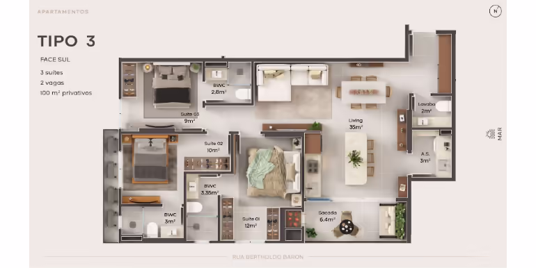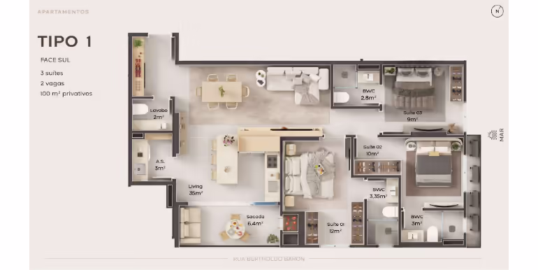 - Tipos 01 e 03: 3 Suítes / Sacada / 2 Vagas / 100 m²