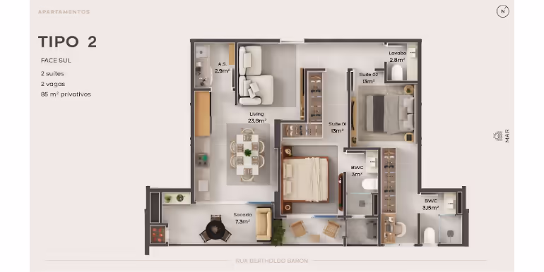 - Tipo 02: 2 Suítes / Sacada / 2 Vagas / 85 m²