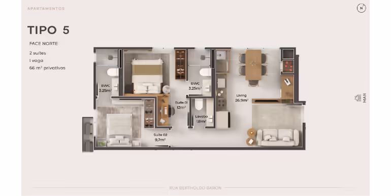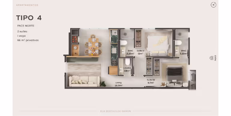 - Tipo 04 e 05: 2 Suítes / 1 Vaga / 66 m²