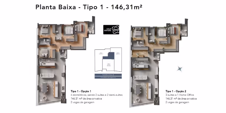- Tipo 01: 2 Suítes + 2 Demi-Suítes ou 3 Suítes + Home Office / 146 m²