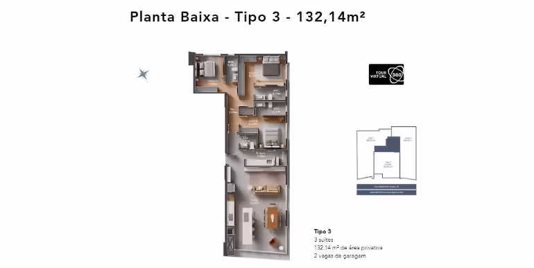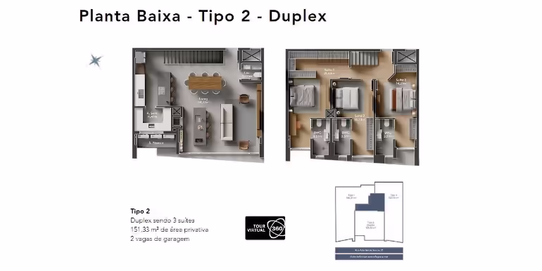 - Tipo 02: 3 Suítes / 151 m² / Duplex