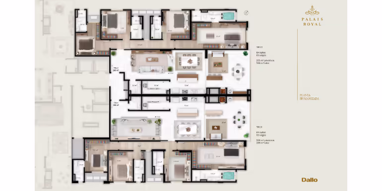 - Tipo 01: Frente / 4 Suítes / 3 Vagas / 206 m²