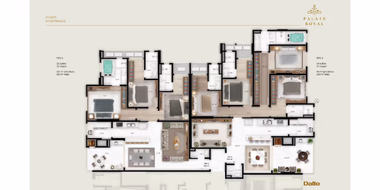 - Tipo 02: Frente / 4 Suítes / 3 Vagas / 203 m²