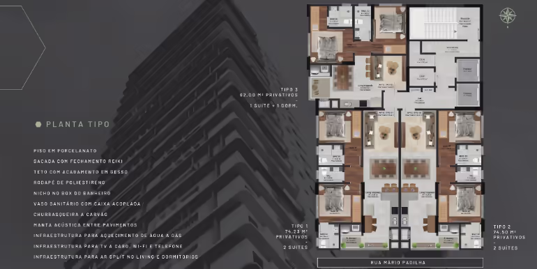 - Tipo 01: Frente Rua / 2 Suítes / 74 m²