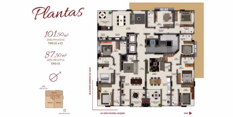 - Tipos 01 e 02: 3 Suítes / 101 m²
