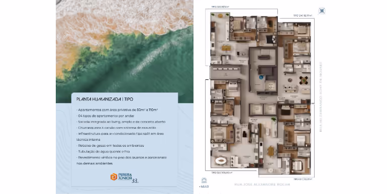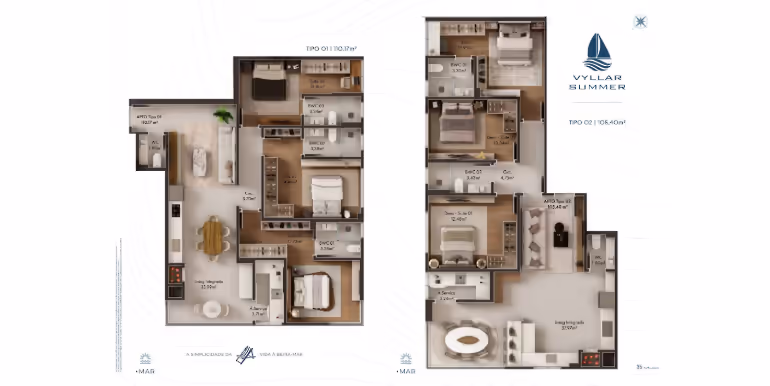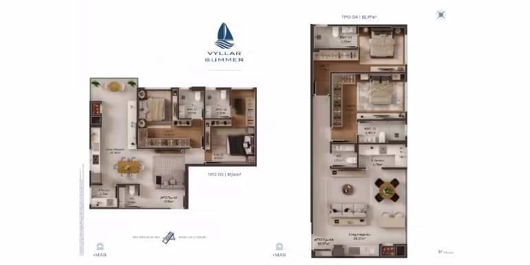 - Tipo 02: 1 Suíte + 2 Demi-Suítes / 105 m²