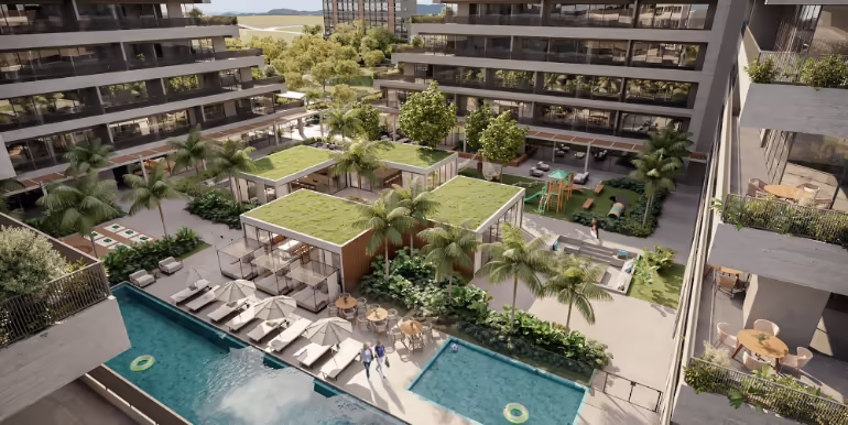 Apartamentos no Edifício Vértice no Vivapark em Porto Belo. Imóvel na planta, com opções de studio, 1 ou 2 suítes e área lazer home club com 3.200 m², num dos empreendimentos mais icônicos do Vivapark, o 1º bairro planejado do Brasil.